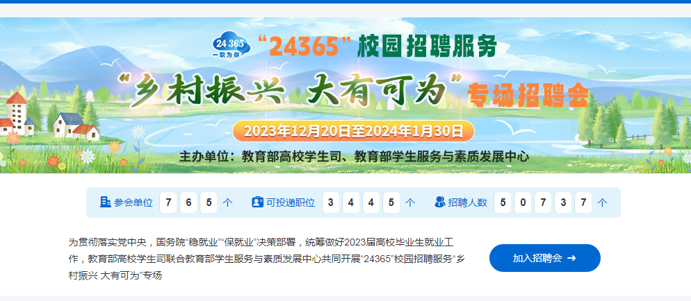 为贯彻落实党中央,国务院“稳就业”“保就业”决策部署,统筹做好2023届高校毕业生就业工作,教育部高校学生司联合教育部学生服务与素质发展中心共同开展“24365”校园招聘服务“乡村振兴 大有可为”专场。