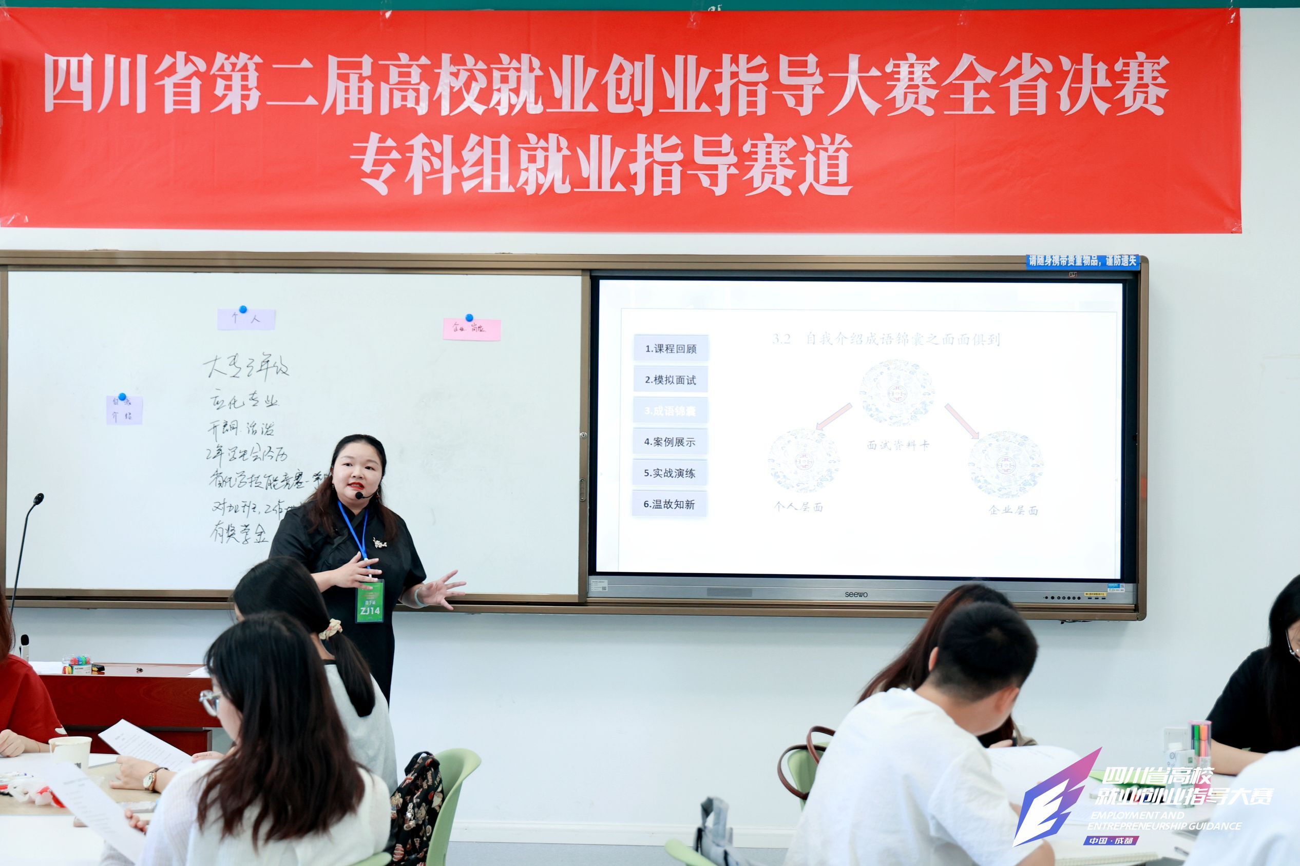 决赛中,李简老师的《成就面试、语出不凡——面试中的成语锦囊》、马梦蝶老师的《基于思维导图法的页岩气教学》现场教学演示课,既有理论创新又贴近学生实际需求,得到了现场评委和同学们的一致认可。指导案例展示、评委问答、无领导小组等环节也表现突出。最终,学校李简老师荣获四川省第二届高校就业创业指导大赛专科组就业赛道“一等奖”,马梦蝶老师荣获创业赛道“三等奖”。