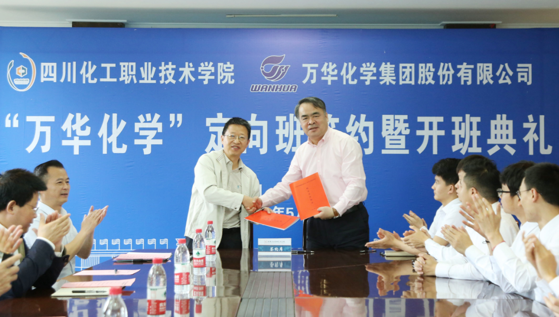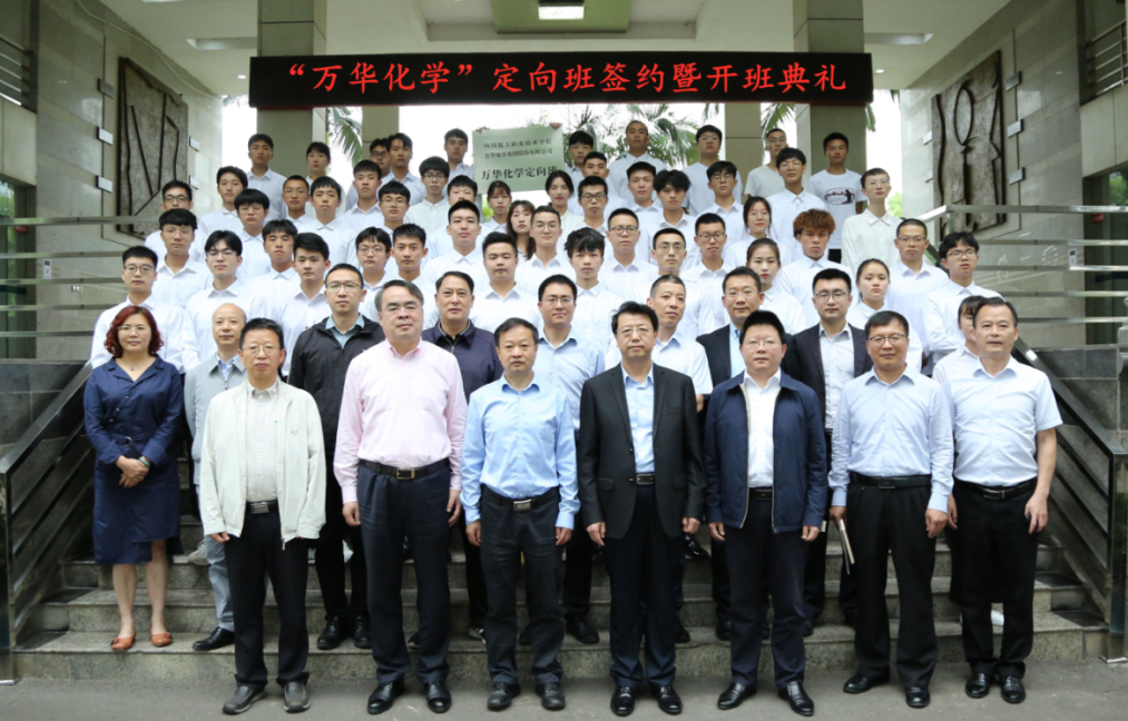 2021年5月24日,学校与万华化学集团股份有限公司共同打造的“万华化学”定向班签约暨开班典礼在学校三楼会议室隆重举行。万华化学集团股份有限公司高级副总裁陈毅峰、高级人力资源总监兼赵继德、集团招聘经理白朔、万华化学四川基地副总经理薛锋、四川化工职业技术学院党委书记刘志勇、校党委委员、院长文申柳、校党委委员、副院长蒲开伦以及签约万华化学定向班的40余名(部分)学生代表参加签约仪式。仪式由学校招生就业处(校企办)处长罗伦忠主持。