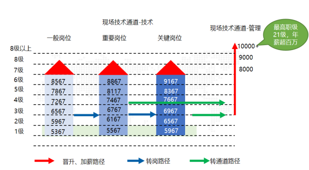 三、职业晋升:提供各类免费带薪培训、内部多岗位竞岗晋升,每三个月晋升一次,每晋级一级加薪200元/月。一般岗位--重要岗位---关键岗位---技术岗(逐级晋升)