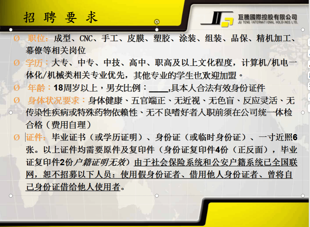 巨宝精密加工有限公司是由仁宝电脑与巨腾国际共同出资新建,主要为DELL、APPLE、SONY、华硕等知名企业提供计算机配件组装、精密射出成型、产品设计制造、内构件材料及镁合金相关制品的生产服务,公司座落于南京东郊句容经济开发区,占地面积1500亩,环境优美,设施完善。 现诚招以下人员: