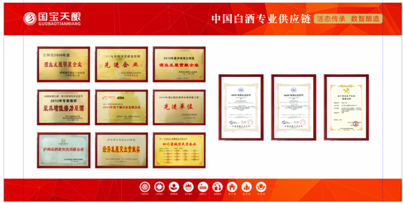公司先后荣获“原酒十强企业”、“酒业发展明星企业”、“四川省质量管理先进企业”、“商业诚信计量示范单位”、“四川省诚信民营企业”、“泸州市酒业突出贡献企业”,年年荣膺“纳税大户”,为行业和地方经济的发展做出了卓越的贡献。