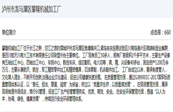 公司现有员工50多人,其中高级技师1名,数控设备操作者70%以上具有大专文凭,厂房面积2252m2,主要生产设备有:五轴加工中心、四轴加工中心、车铣中心、数控车床、线切割机、电火花等,高、精、尖设备40多台,固定资产1500万余万元,主要从事航天、航空,军工精密零件加工和精密模具、石油零配件、机床配件加工、组装和维修服务。公司通过GJB9001C-2017国军标质量管理体系认证。