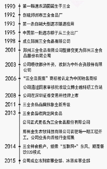 三全食品(股票代码002216)是全国最大的速冻食品生产企业,中国速冻食品行业的开创者和领导者。公司目前在郑州、广州、成都、苏州、天津等地建有基地公司,在全国设有几十个销售分公司和现代化的物流配送中心,公司的生产能力和装备水平均处于国内领导地位。
