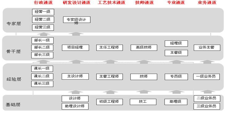 说明:以上为我公司为各个岗位提供的职业发展通道,根据员工的个人成长可以向研发设计、工艺技术、专业、业务方向发展。任何一个晋升通道中的职员通过自身的努力都可以得到职位和薪资上的提高。